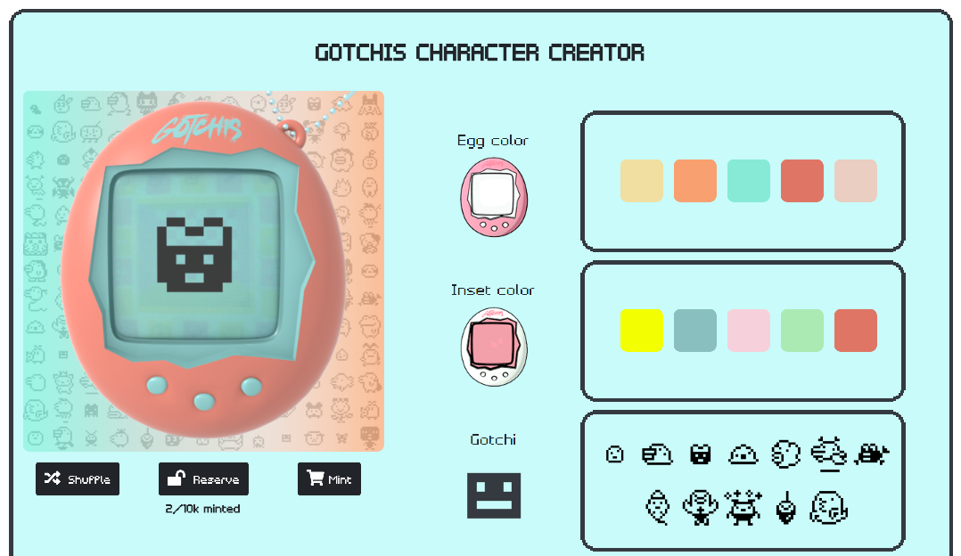 Gotchis features a custom NFT experience where you pick your attributes through our character creator. You pick out which unique Gotchi you want to mint!